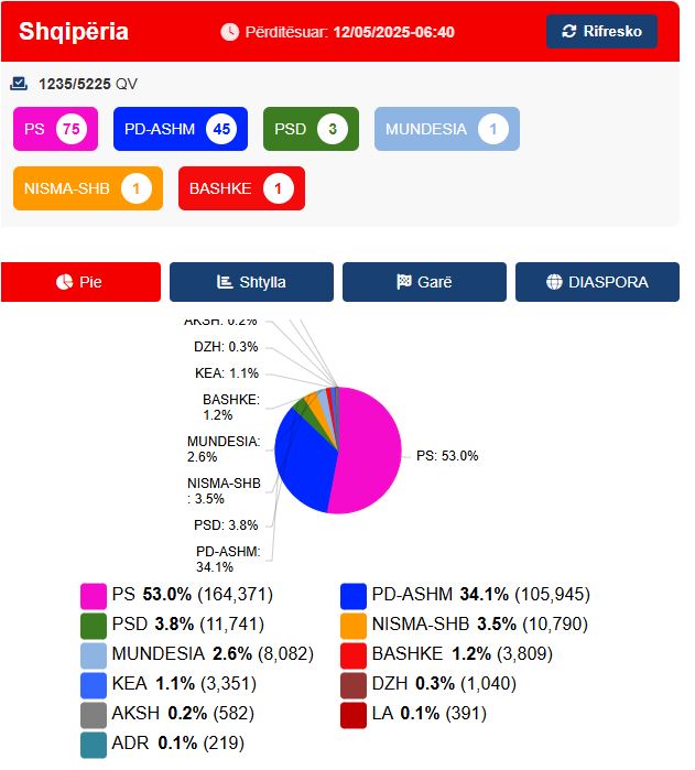 PS kryeson me 164,371 vota, ndërsa PD-ASHM ka marrë 195,945 vota për momentin. Forcë e tretë e ndjek PSD e Tom Doshit me 11,741 vota dhe më pas vjen e katërta, Shqipëria Bëhet e Adriatik Lapajt me 10,790 vota