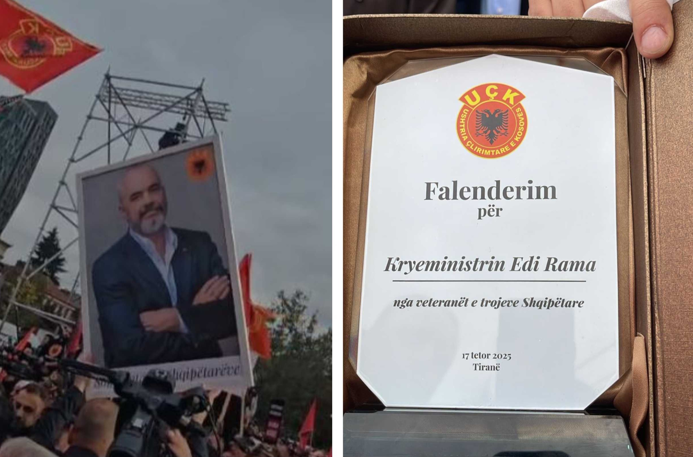 Veteranët e Ushtrisë Çlirimtare të Kosovës dorëzuan dy dhurata simbolike për kryeministrin Edi Rama, në shenjë falënderimi për mbështetjen ndaj protestës në mbështetje të ish-krerëve të UÇK-së që po gjykohen në Hagë.